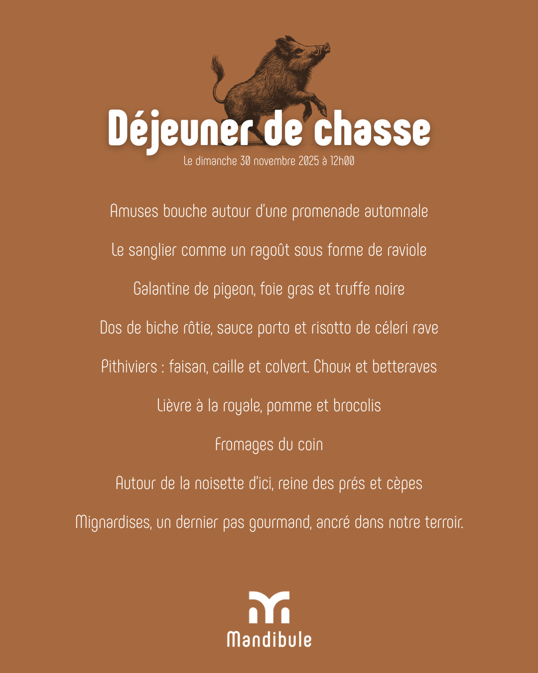 Un moment hors du temps, célébrant la nature à travers la richesse du gibier et les saveurs automnales. Chaque plat raconte la forêt, la plaine, la brume du matin et la chaleur du feu.