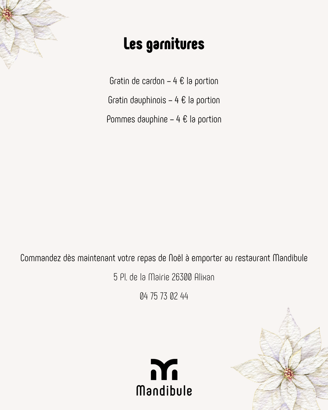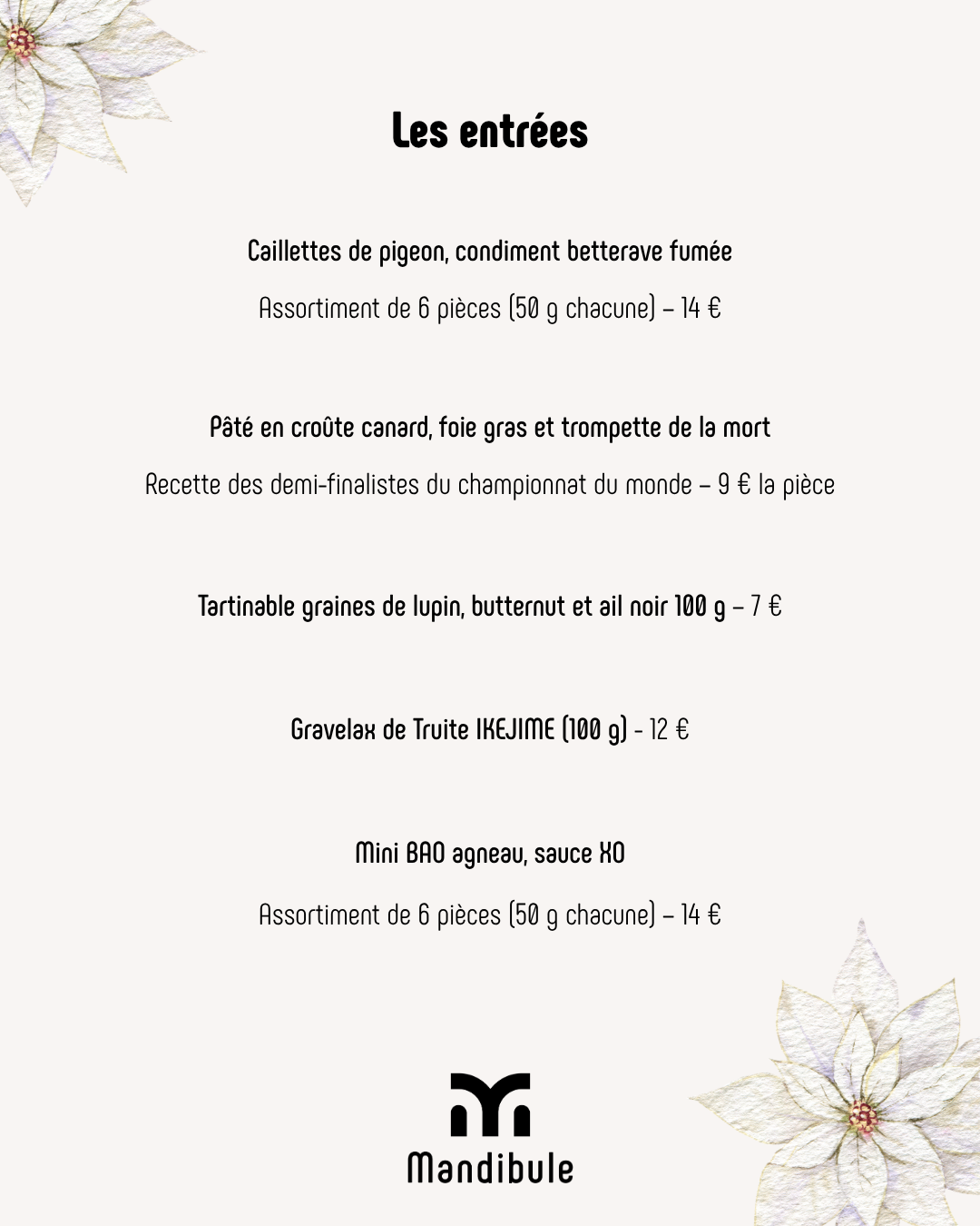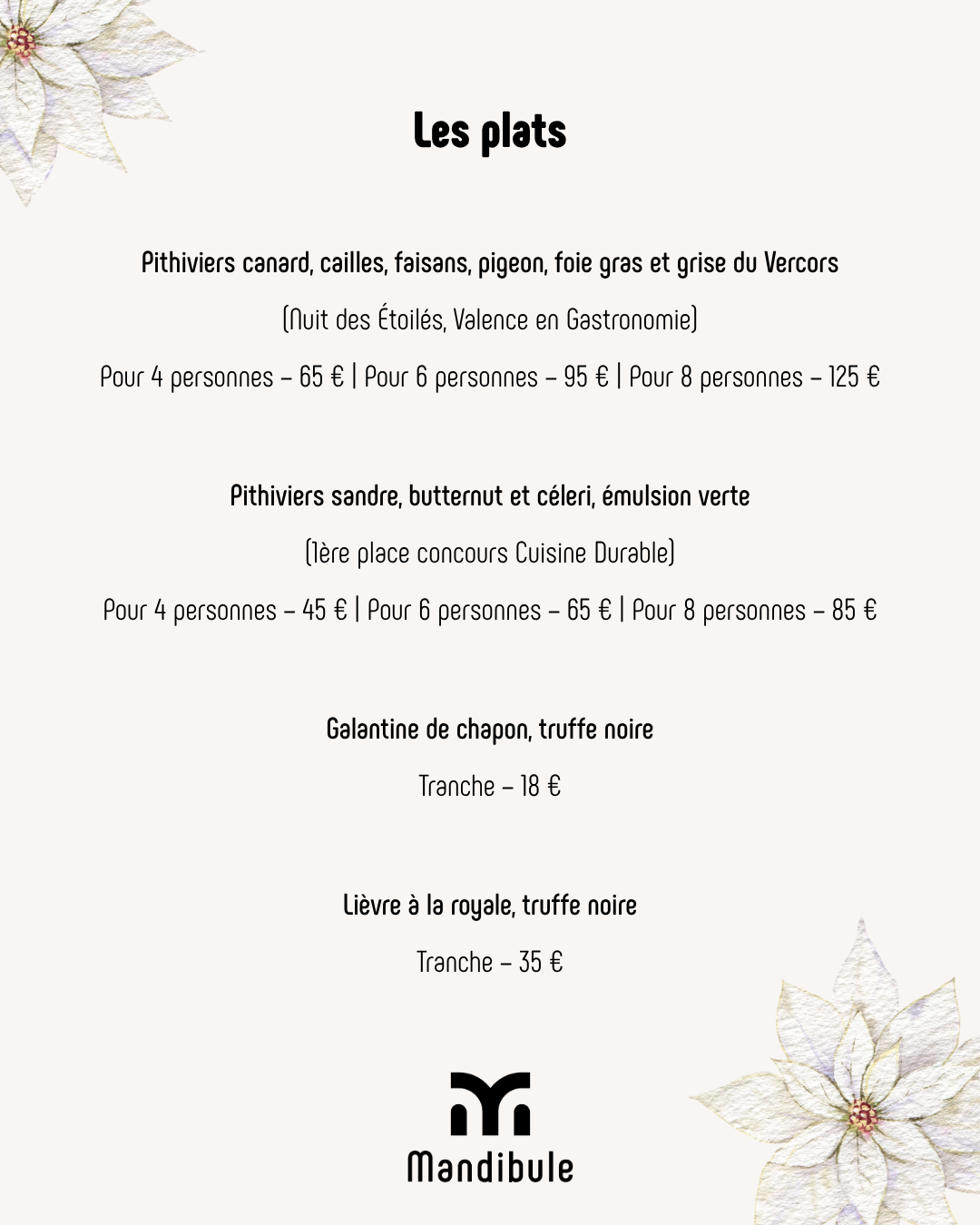 Célébrez les fêtes avec un menu de Noël raffiné, entièrement fait maison et élaboré à partir de produits locaux issus de moins de 20 km autour d’Alixan. Une cuisine créative, durable et festive, à savourer chez vous en toute simplicité. Un Noël gourmand, responsable et signé Mandibule.